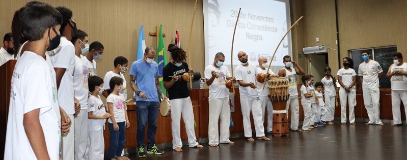 E como símbolo de luta e resistência negra, que está na raiz da cultura brasileira, o plenário da Câmara recebeu uma bela apresentação de uma roda de capoeira. Alunos da Associação Cultural Esportiva e Social 100% Capoeira, capitaneado pelo líder comunitário e mestre Geraldo Máscara, cheios de ginga, e aos sons de berimbaus e tambores, deram uma bela apresentação dessa arte marcial trazida da África ainda no século XVI.