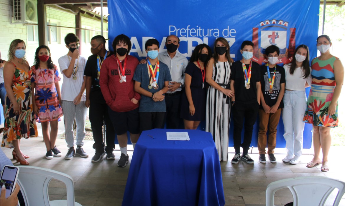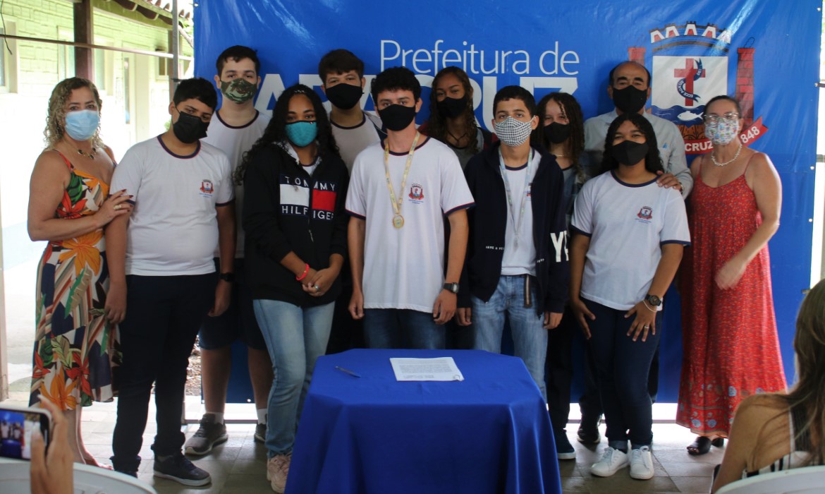 A Secretaria Municipal de Educação (Semed) homenageou estudantes, escolas e professores que foram premiados durante o ano letivo de 2021 durante a solenidade de assinatura de Termo de Cooperação para Implantação de Escolas Integrais, que aconteceu ontem (20), em frente ao Gabinete do Prefeito.