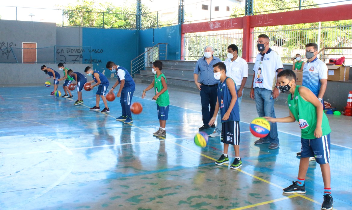 Na manhã desta terça-feira (22), cerca de 20 alunos da rede municipal de ensino que participam do projeto Ídolo Social, uma parceria firmada entre a Prefeitura de Aracruz, por meio da Secretaria de Esporte, Lazer e Juventude (Semesp), e o Instituto Anderson Varejão (IAV), receberam o material esportivo para a prática das atividades da modalidade basquetebol. A entrega foi feita na quadra poliesportiva do bairro Cohab IV. Hoje o projeto atende 170 alunos, entre crianças e adolescentes, em todo o município.