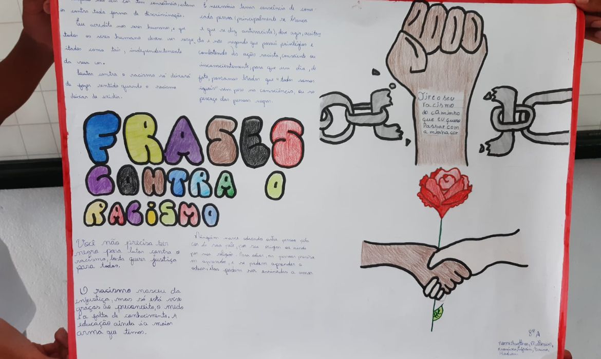Apesar das importantes conquistas do povo negro a partir de 1888, a desigualdade e o preconceito racial continuam sendo um grande problema social. Pensando nisso, a escola acredita que combater essa questão é quebrar um ciclo histórico de violências acometidas contra essa população. Os estudantes confeccionaram cartazes de combate ao racismo, e na companhia da professora Dayane, visitaram as turmas conscientizando os colegas sobre o respeito ao próximo, o convívio pacífico e principalmente, a valorização da diversidade racial.