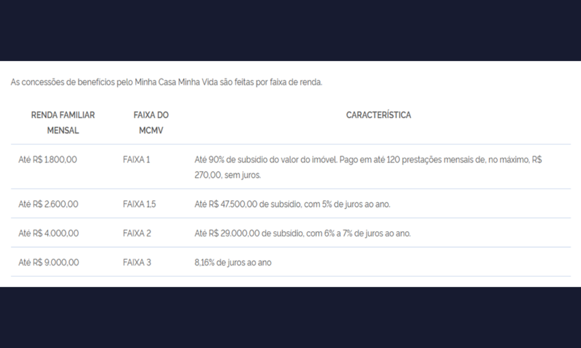 A Secretaria de Habitação e Defesa Civil de Aracruz informa à população que o valor da renda familiar limite para participação nos Programas Habitacionais é definida pelo Governo Federal, sendo assim o valor de R$ 1.800,00 do Residencial Barra do Riacho, deve-se ao fato que o empreendimento está enquadrado na Faixa Salarial 1 do Programa Minha, Casa Minha Vida, conforme imagem abaixo retirada do site do programa.