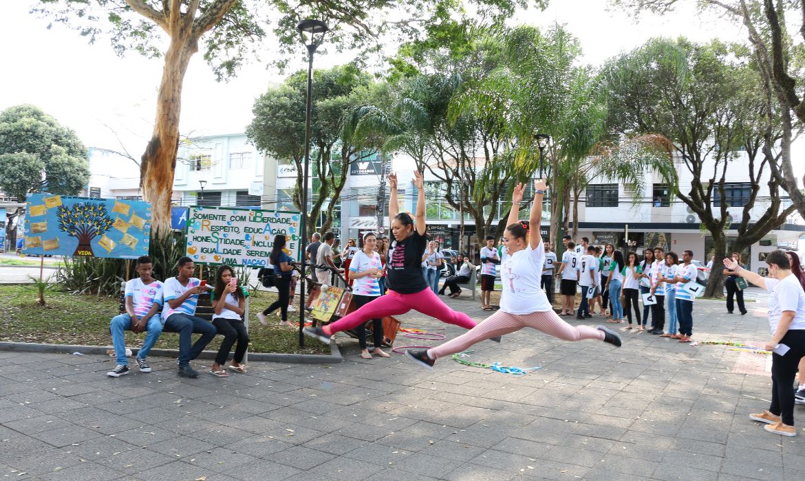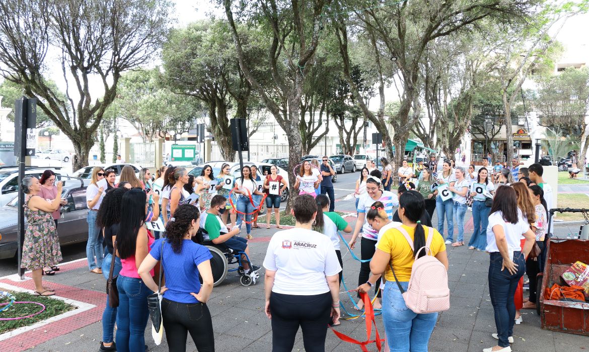 Já na parte da tarde a ação se concentrou na Praça Monsenhor Guilherme Shimitz (Matriz). Houve distribuição de panfletos informativos e participação das escolas EMEF Maria Inês Della Valentina, de Jacupemba e EEEM Misael Pinto Netto, Centro. Os alunos e servidores fizeram uma bela apresentação ao estilo “Flash Mob”. Em grupos, ao som de músicas, eles se reuniam repentinamente com performances distintas, como danças, coreografias, gingas e mostras de faixas e cartazes.