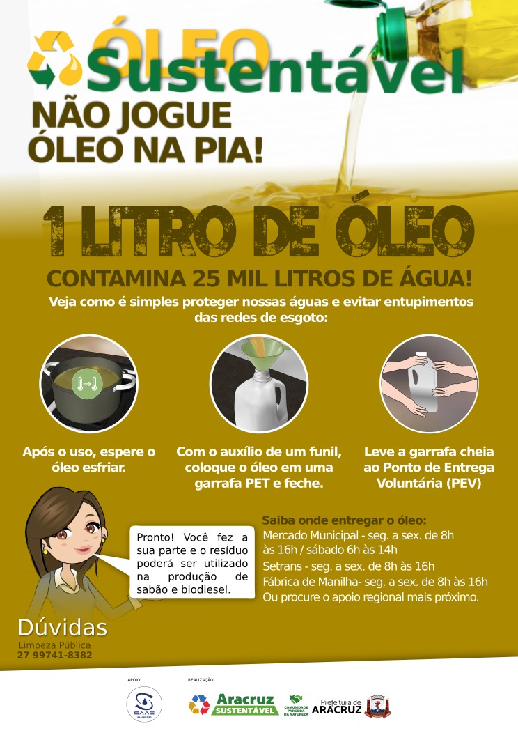 A Prefeitura de Aracruz, por meio da Secretaria de Transportes e Serviços Urbanos (Setrans), desenvolve a campanha para recolhimento de óleo vegetal. O projeto orienta a população quanto a destinação correta do produto, assim, contribuindo para a proteção dos recursos hídricos, evitando entupimentos das redes de esgoto, além de possibilitar a produção de sabão e biodiesel.