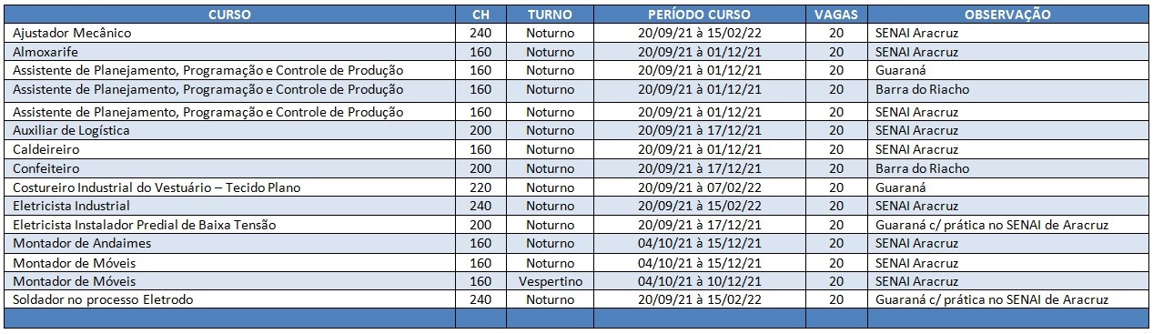 A Prefeitura de Aracruz, por meio da Secretaria de Desenvolvimento Econômico (Semde), em parceria com o Centro Integrado – SENAI/SESI/IEL, disponibiliza 300 vagas distribuídas em 12 cursos gratuitos de qualificação profissional para munícipes, com idade a partir de 16 anos.