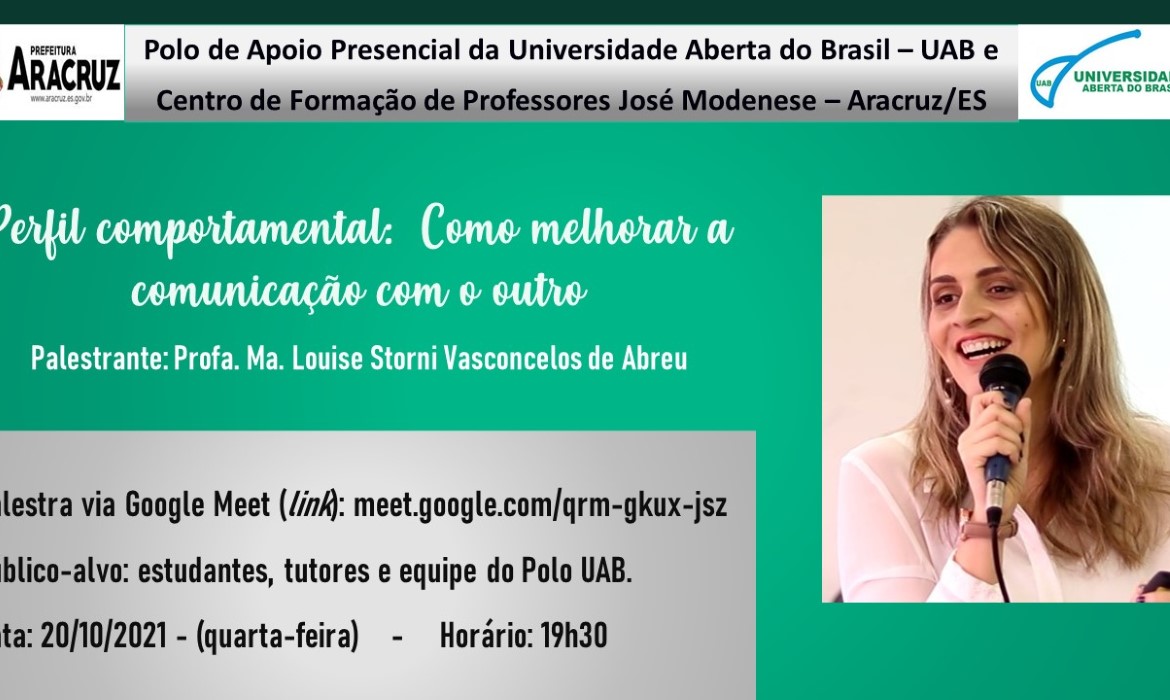 O Polo da Universidade Aberta do Brasil (UAB) Aracruz e o Centro de Formação de Professores José Modenese vai realizar amanhã (20), na sede da instituição, às 19h30, uma palestra para estudantes, tutores e equipe com o tema “Perfil Comportamental: como melhorar a comunicação com o outro”.