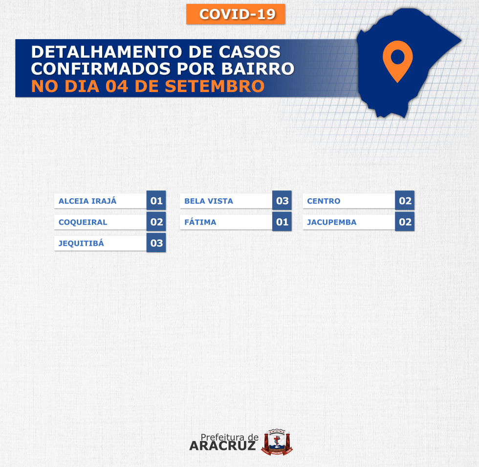 O município de Aracruz registrou 14 casos confirmados de Covid-19. Os bairros dos casos confirmados de hoje podem ser conferidos no segundo card desta publicação.