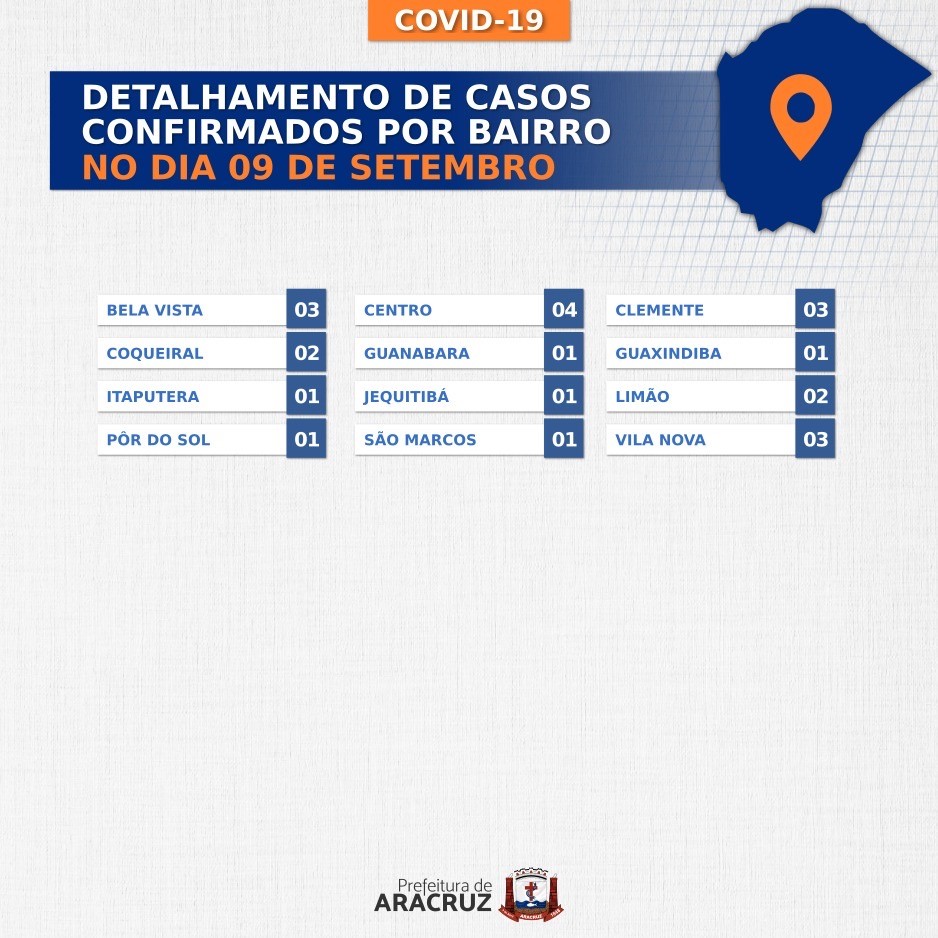 O município de Aracruz registrou 23 casos confirmados de Covid-19. Os bairros dos casos confirmados de hoje podem ser conferidos no segundo card desta publicação.