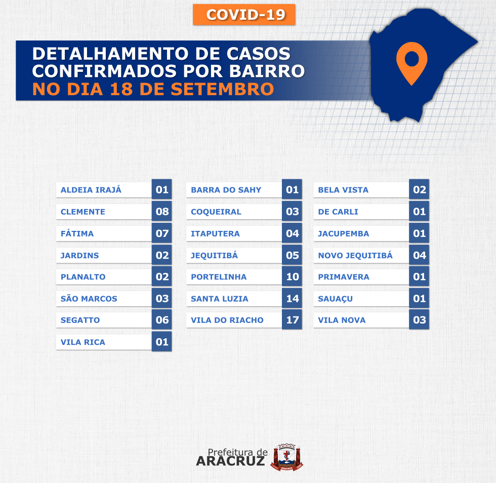 O município de Aracruz registrou 97 casos confirmados de Covid-19. Os bairros dos casos confirmados de hoje podem ser conferidos no segundo card desta publicação.