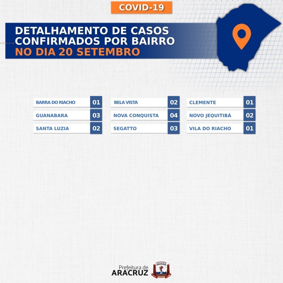 O município de Aracruz registrou 19 casos confirmados de Covid-19. Os bairros dos casos confirmados de hoje podem ser conferidos no segundo card desta publicação.