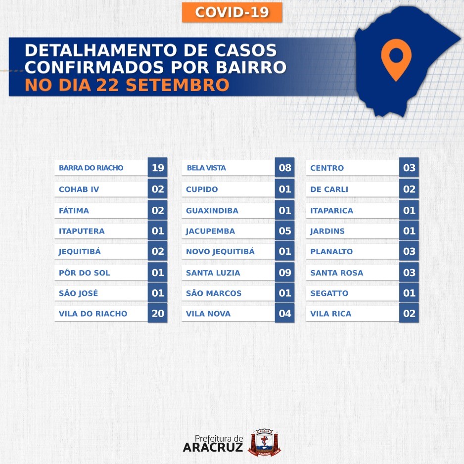 O município de Aracruz registrou 94 casos confirmados de Covid-19. Os bairros dos casos confirmados de hoje podem ser conferidos no segundo card desta publicação.