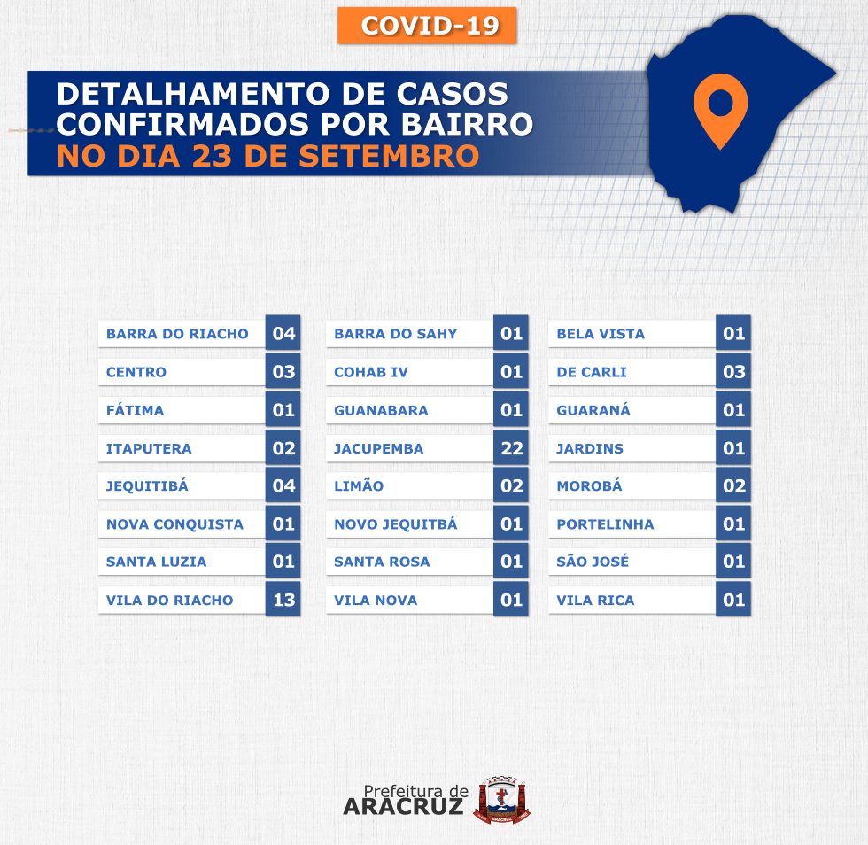 O município de Aracruz registrou 70 casos confirmados de Covid-19. Os bairros dos casos confirmados de hoje podem ser conferidos no segundo card desta publicação.