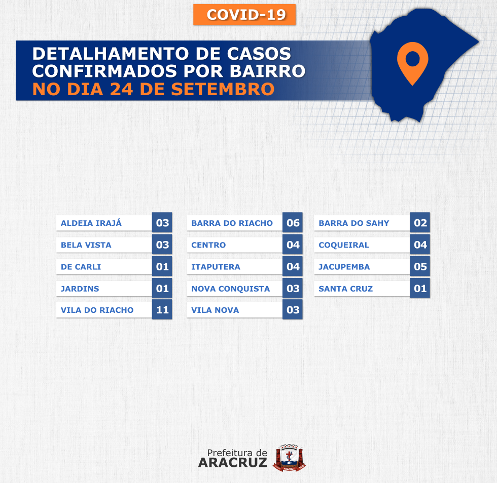 O município de Aracruz registrou 51 casos confirmados de Covid-19. Os bairros dos casos confirmados de hoje podem ser conferidos no segundo card desta publicação.