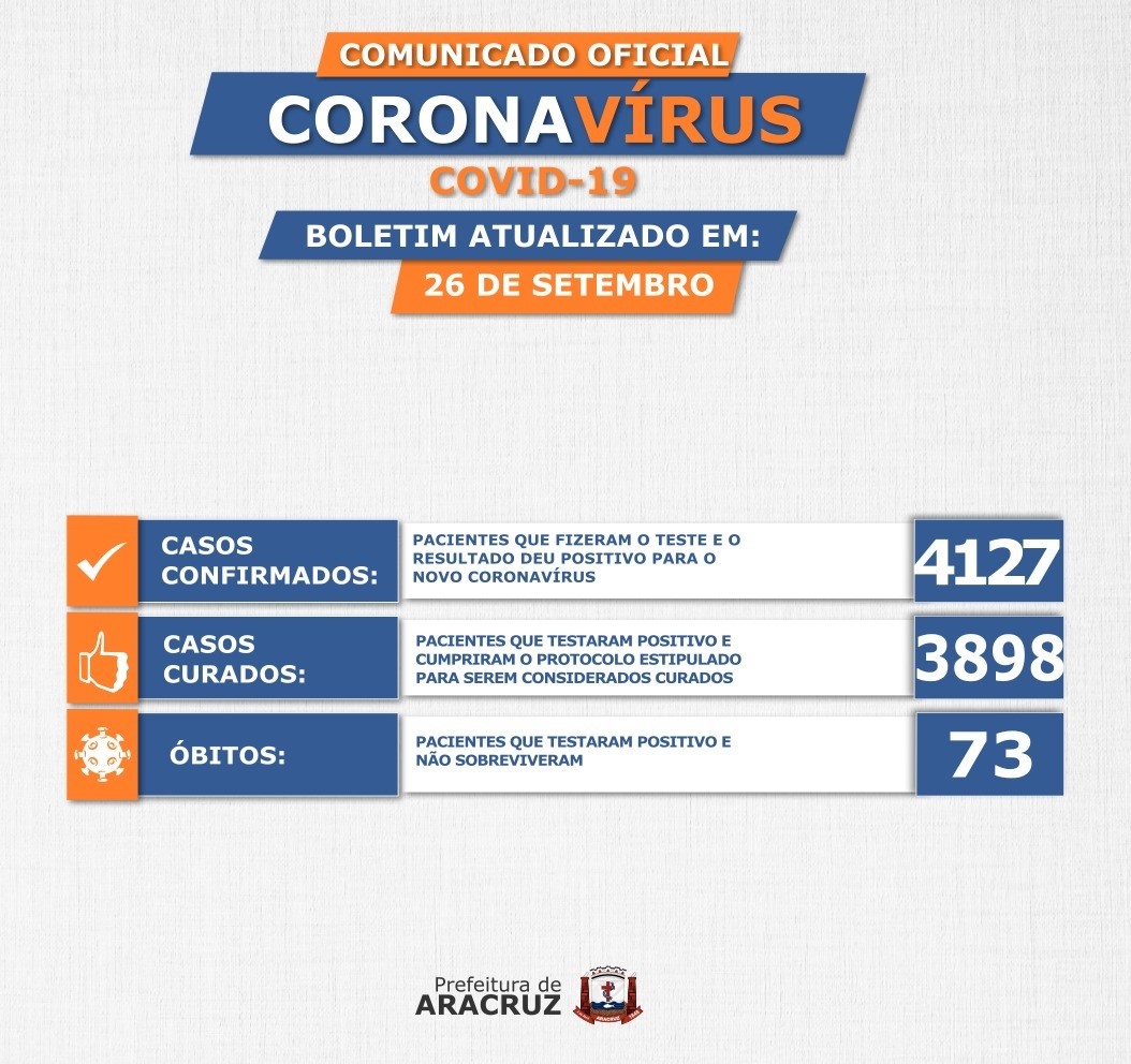 Confira o boletim Epidemiológico do dia 26/09. Fonte: Secretaria Municipal de Saúde (Semsa).