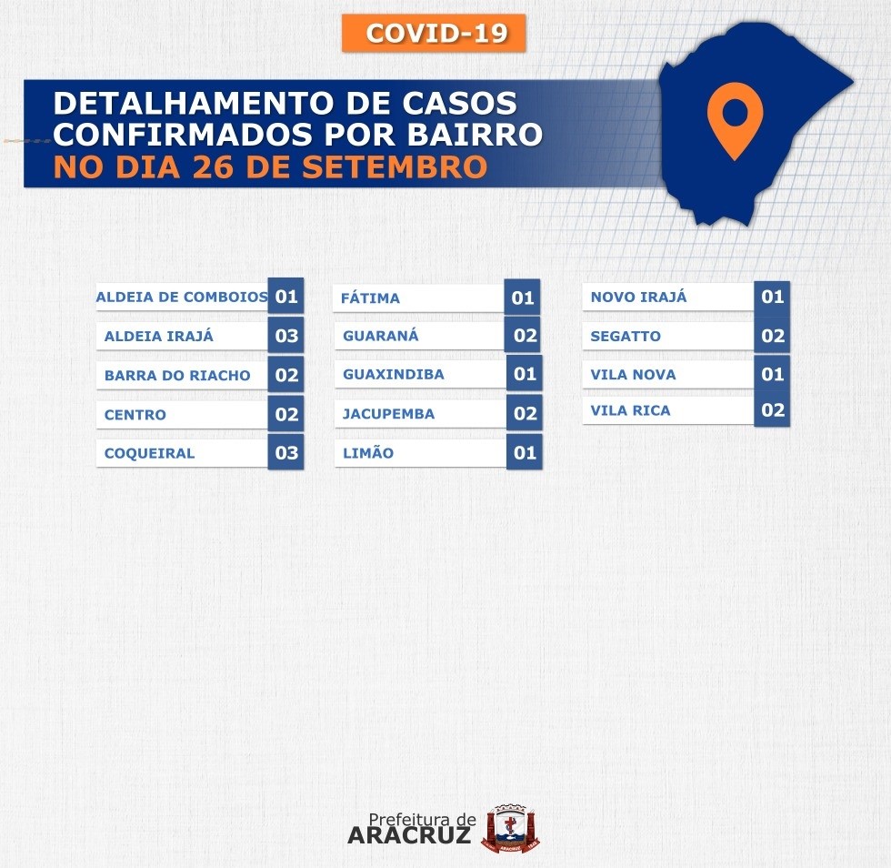O município de Aracruz registrou 24 casos confirmados de Covid-19. Os bairros dos casos confirmados de hoje podem ser conferidos no segundo card desta publicação.