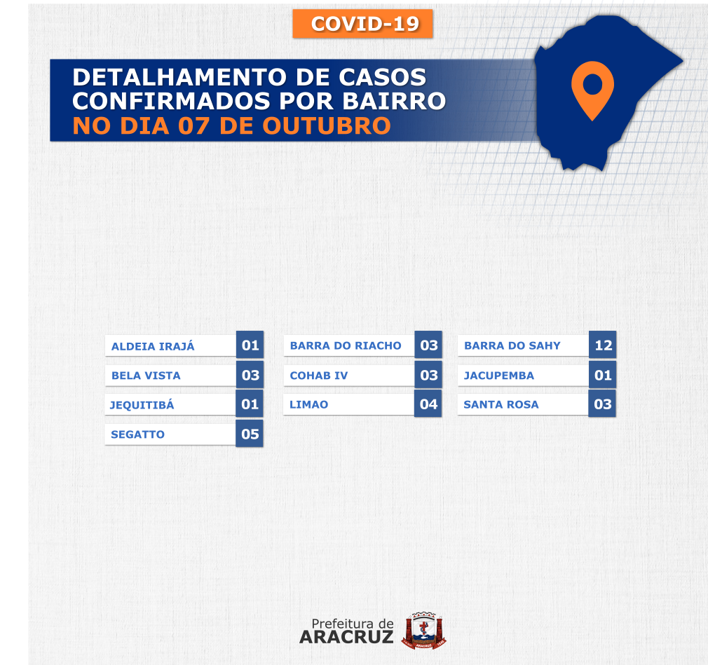O município de Aracruz registrou 36 casos confirmados de Covid-19. Os bairros dos casos confirmados de hoje podem ser conferidos no segundo card desta publicação.