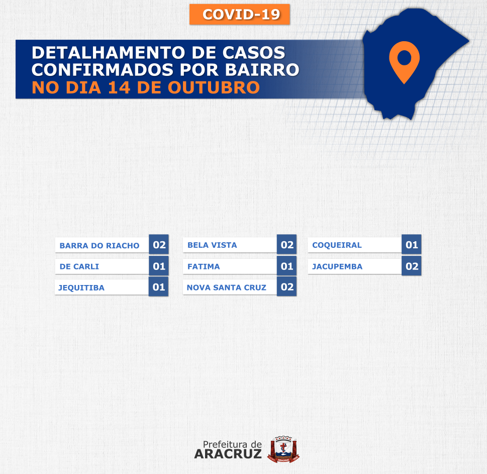 O município de Aracruz registrou 12 casos confirmados de Covid-19. Os bairros dos casos confirmados de hoje podem ser conferidos no segundo card desta publicação.