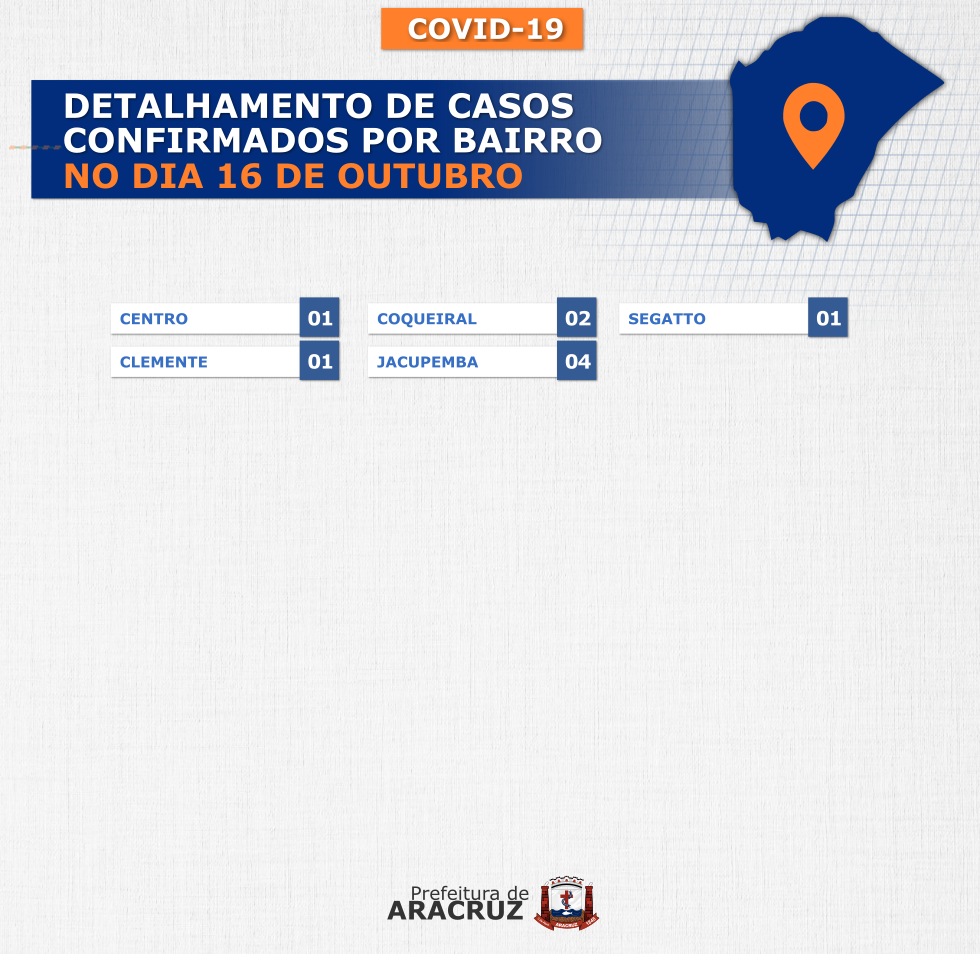 O município de Aracruz registrou nove casos confirmados de Covid-19. Os bairros dos casos confirmados de hoje podem ser conferidos no segundo card desta publicação.