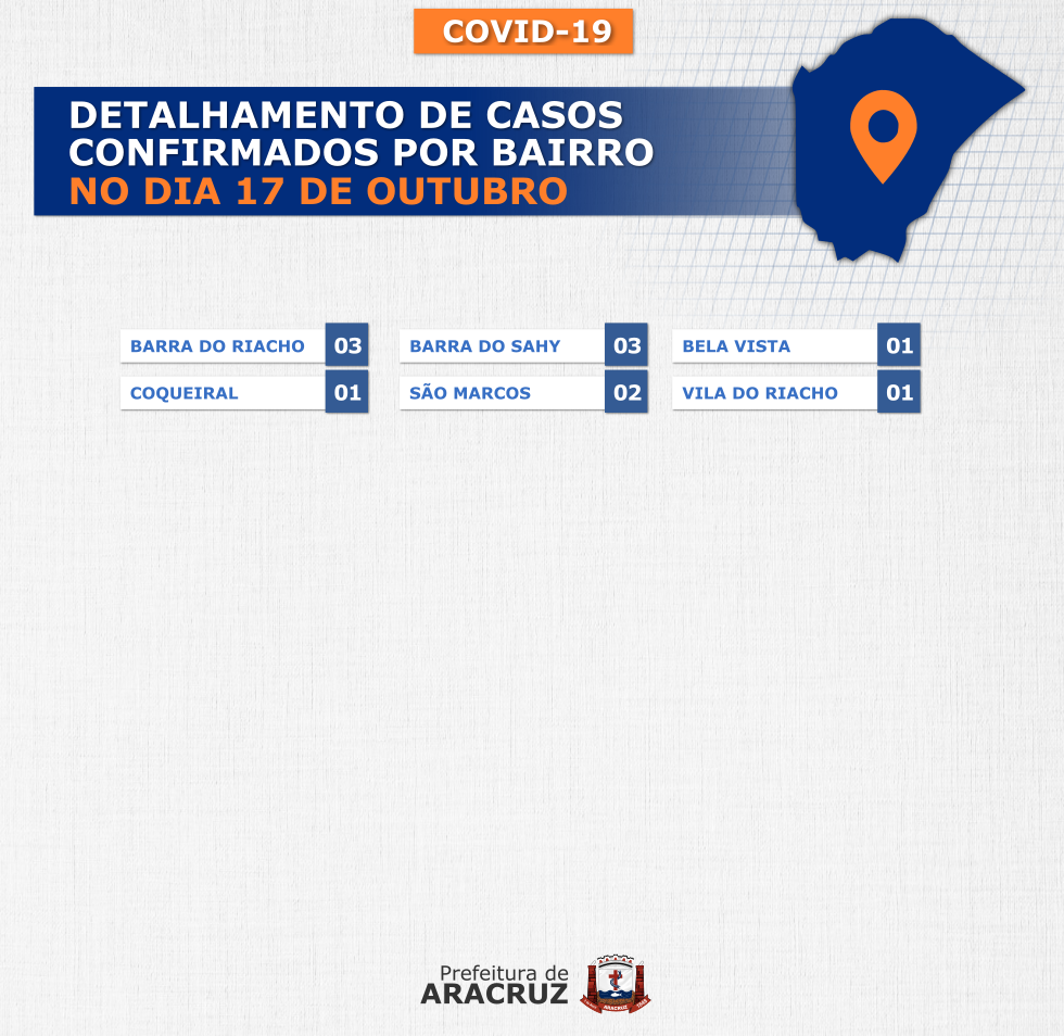 O município de Aracruz registrou 11 casos confirmados de Covid-19. Os bairros dos casos confirmados de hoje podem ser conferidos no segundo card desta publicação.