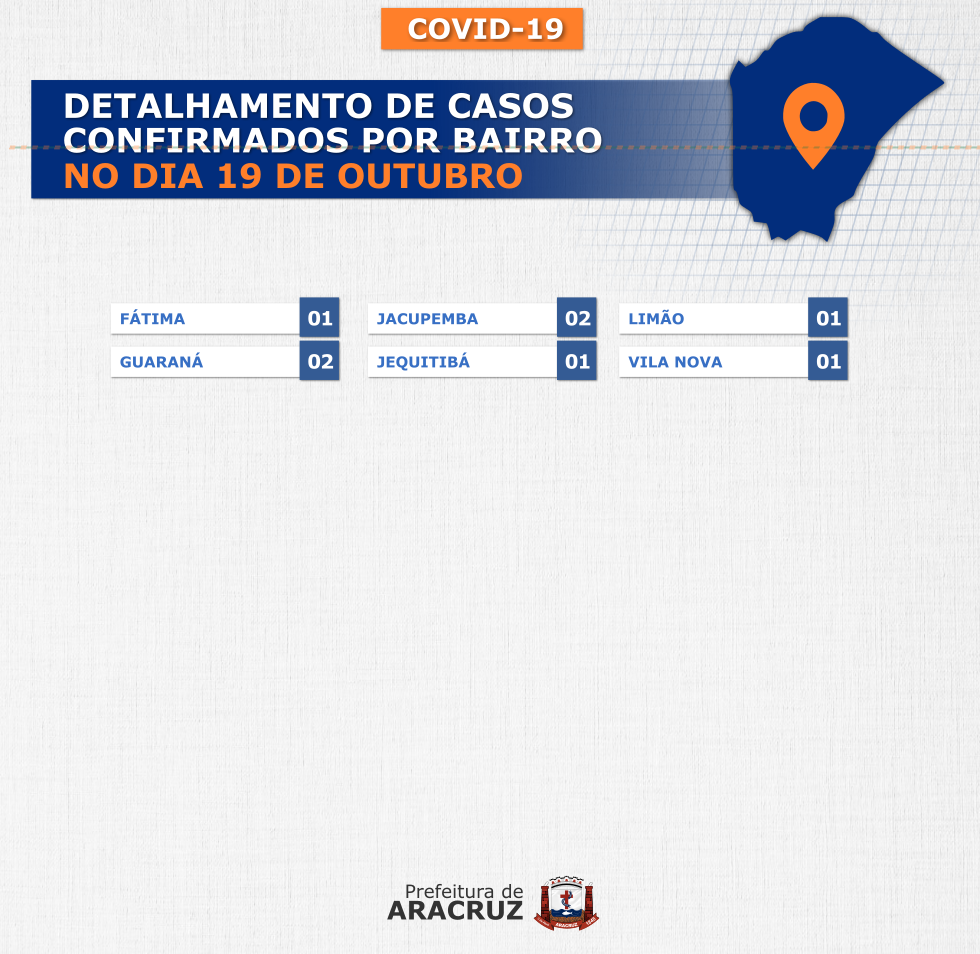 O município de Aracruz registrou 06 casos confirmados de Covid-19. Os bairros dos casos confirmados de hoje podem ser conferidos no segundo card desta publicação.