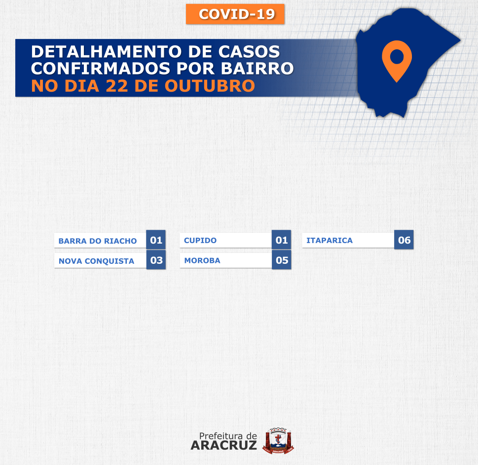 O município de Aracruz registrou 16 casos confirmados de Covid-19. Os bairros dos casos confirmados de hoje podem ser conferidos no segundo card desta publicação.