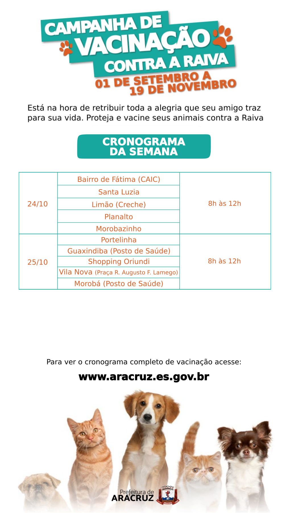 Cronograma da Campanha de Vacinação Contra a Raiva - 24 e 25/10 (Final de semana)