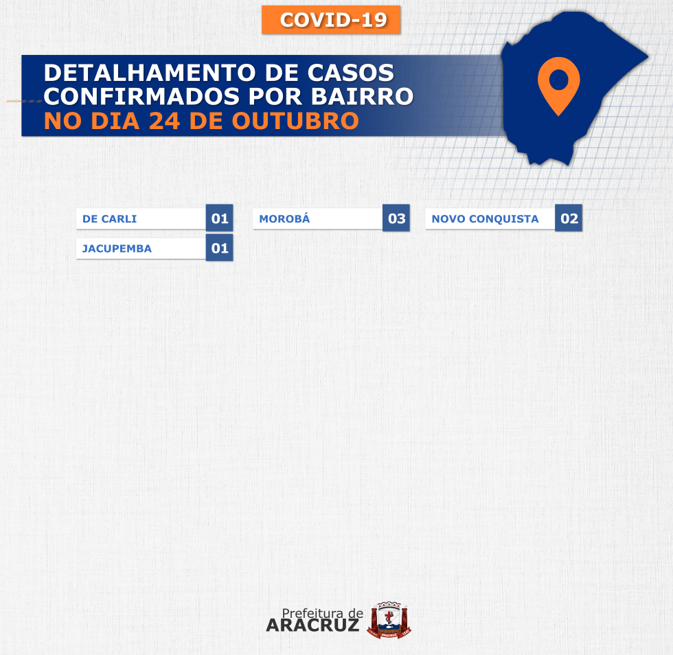 O município de Aracruz registrou 7 casos confirmados de Covid-19. Os bairros dos casos confirmados de hoje podem ser conferidos no segundo card desta publicação.