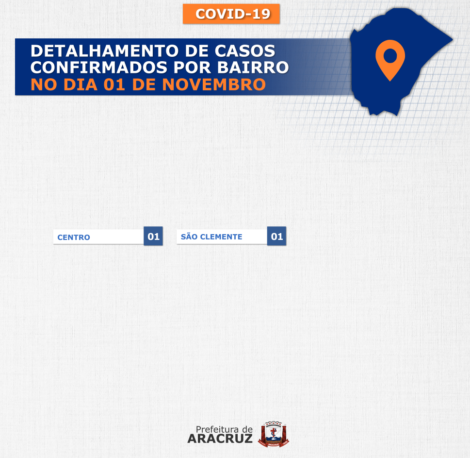 O município de Aracruz registrou 02 casos confirmados de Covid-19. Os bairros dos casos confirmados de hoje podem ser conferidos no segundo card desta publicação.