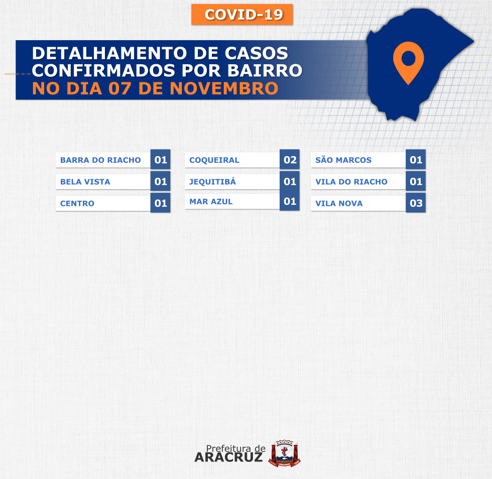 O município de Aracruz registrou 12 casos confirmados de Covid-19. Os bairros dos casos confirmados de hoje podem ser conferidos no segundo card desta publicação.