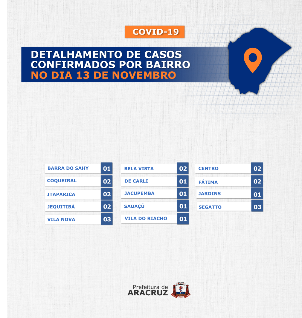 O município de Aracruz registrou 24 casos confirmados de Covid-19. Os bairros dos casos confirmados de hoje podem ser conferidos no segundo card desta publicação.
