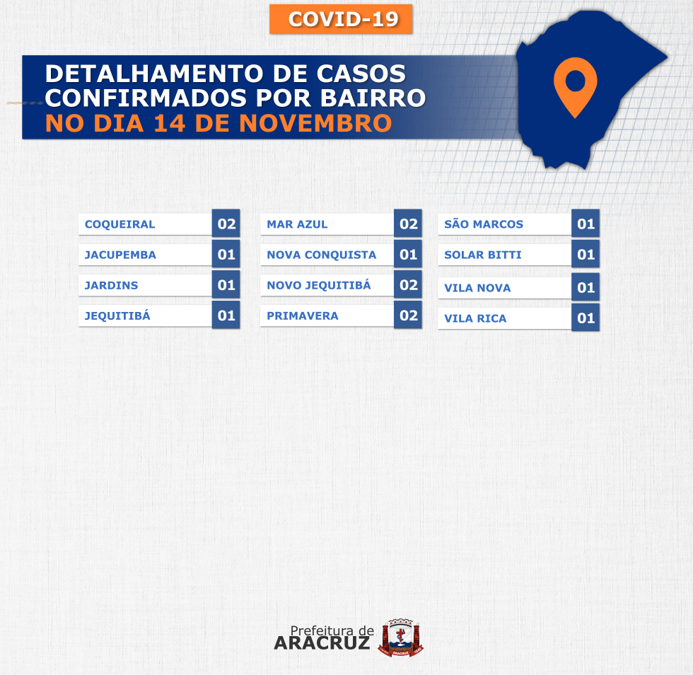 O município de Aracruz registrou 16 casos confirmados de Covid-19. Os bairros dos casos confirmados de hoje podem ser conferidos no segundo card desta publicação.