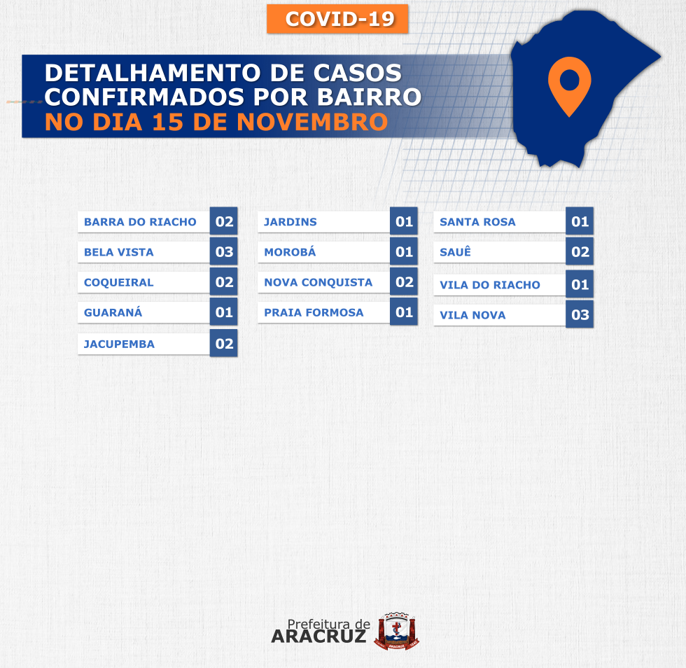 O município de Aracruz registrou 22 casos confirmados de Covid-19. Os bairros dos casos confirmados de hoje podem ser conferidos no segundo card desta publicação.