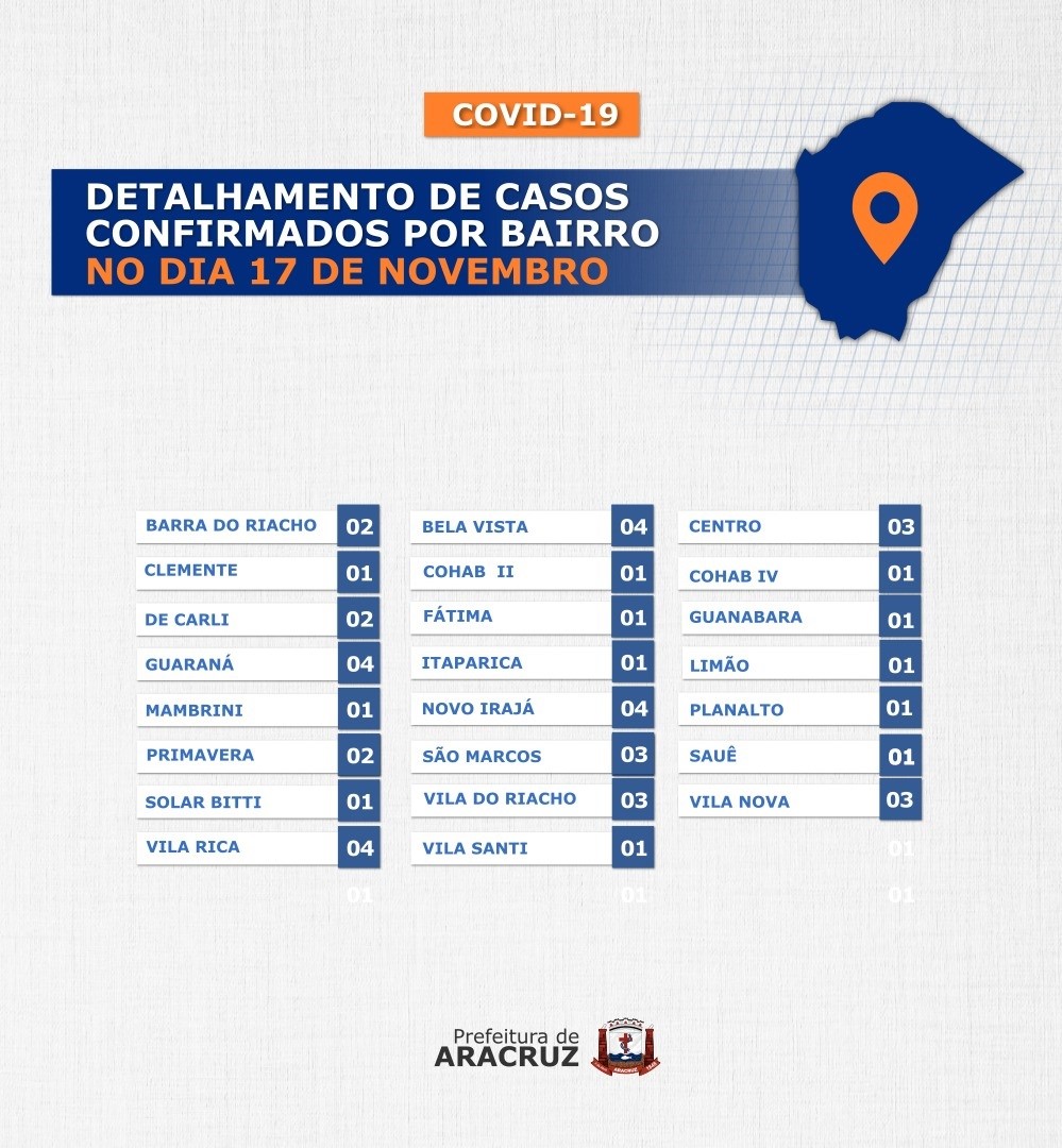 O município de Aracruz registrou 46 casos confirmados de Covid-19. Os bairros dos casos confirmados de hoje podem ser conferidos no segundo card desta publicação.