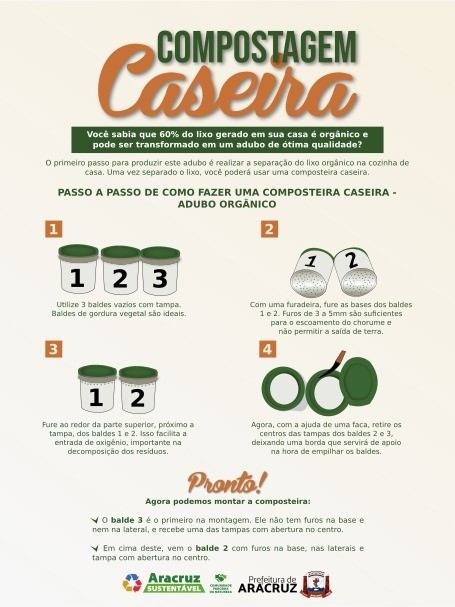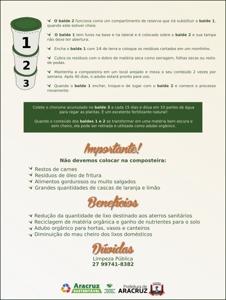 Reciclar, diminuir e transformar o seu próprio lixo doméstico em adubo sem agrotóxico, reduzindo a quantidade de material que é lançado no aterro sanitário. Esse é o objetivo da Secretaria de Transportes e Serviços Urbanos (Setrans), da Prefeitura de Aracruz ao incentivar a população a produzir a compostagem em suas próprias residências ou empresas. “Bastam atitudes simples, que não exigem custos extras, mas apenas uma mudança de hábito que deve partir de cada cidadão”, explica a gerente de Limpeza Pública, Francine Sousa. O processo de compostagem, que é simples e pode ser feito em casa, beneficia o próprio morador, a cidade e o meio ambiente, pois diminui drasticamente a quantidade de lixo enviado aos aterros.