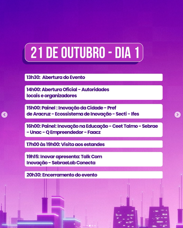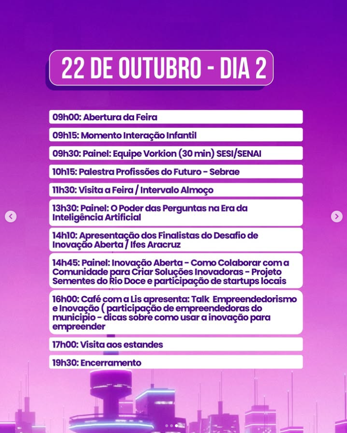 Com uma pauta que conecta educação, tecnologia, sustentabilidade e desenvolvimento econômico, a Cidade Expo Inovadora reafirma o compromisso de Aracruz com o futuro que já começou, e que tem a inovação como principal aliada do crescimento e da transformação social.