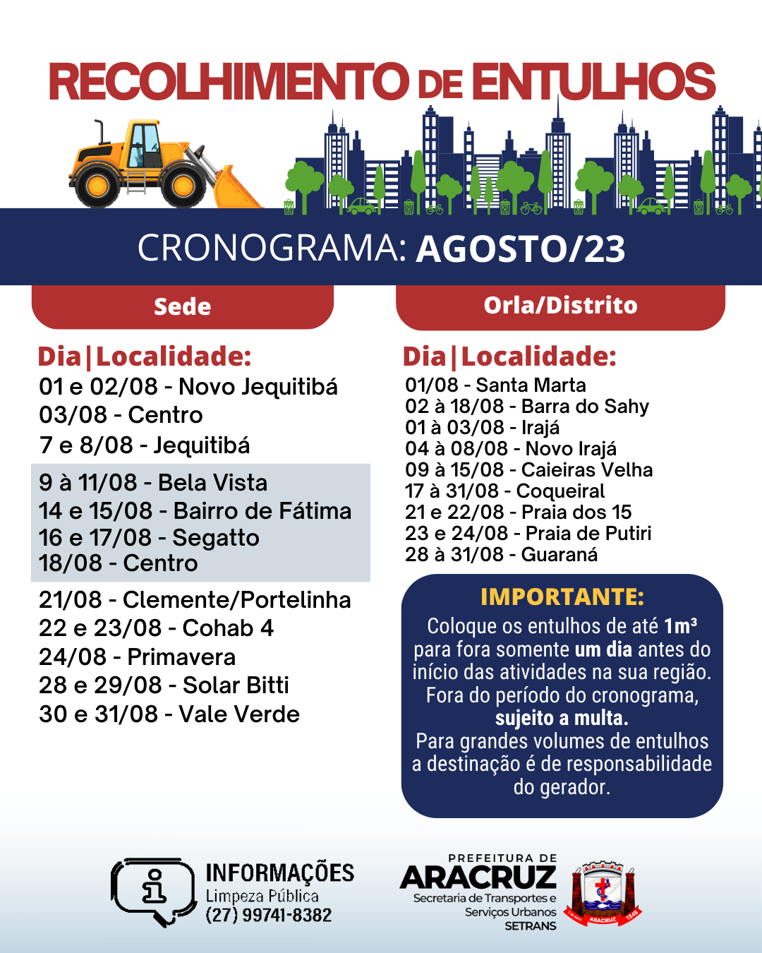 Recolhimento de Entulhos - Cronograma de agosto