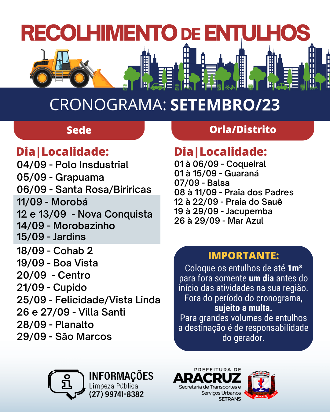Recolhimento de Entulhs - Cronograma de setembro